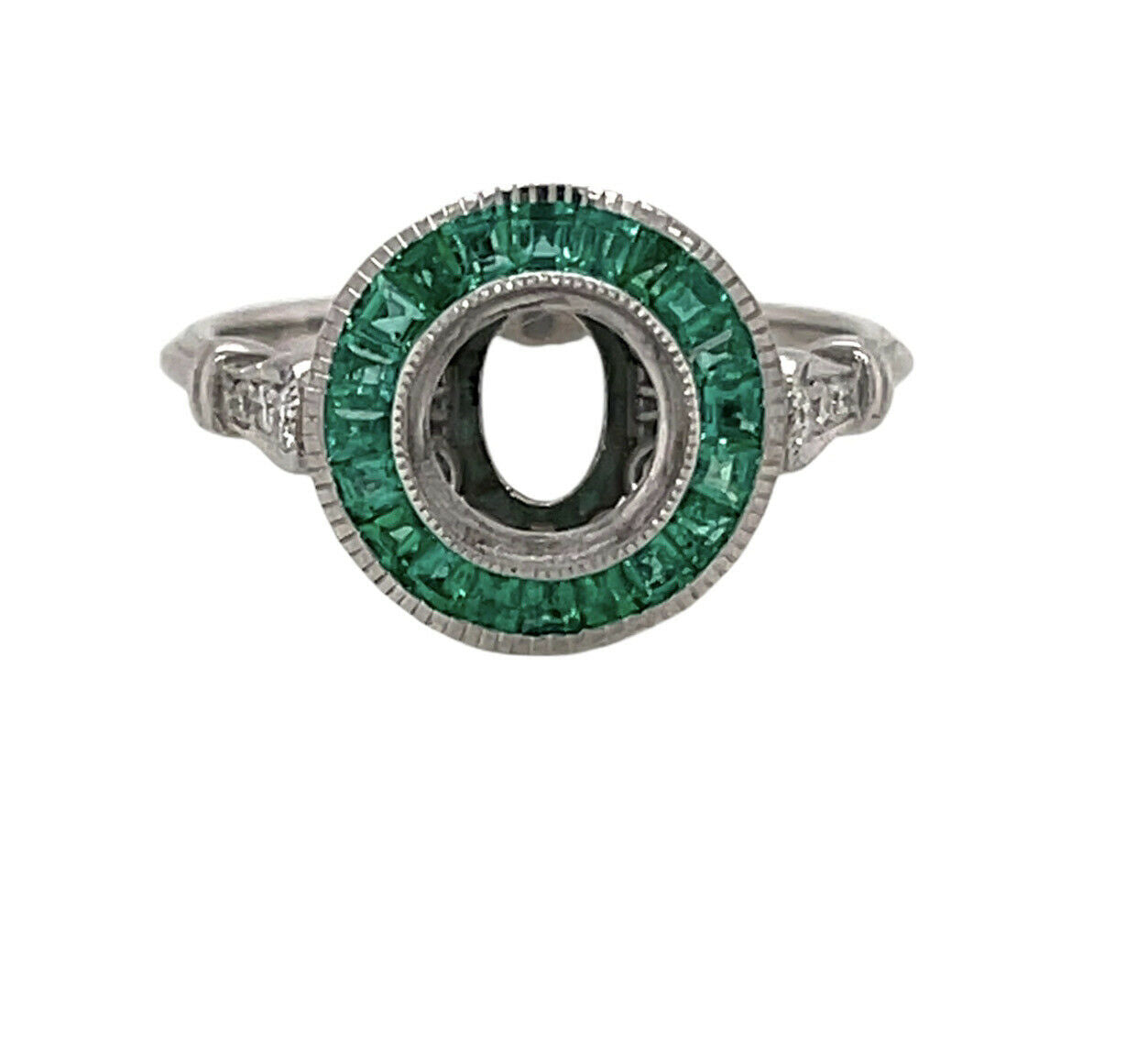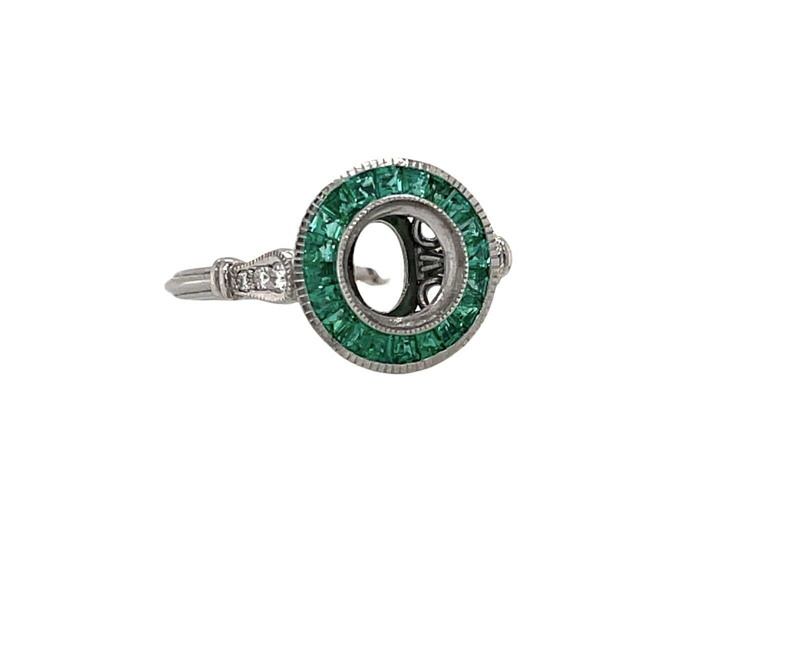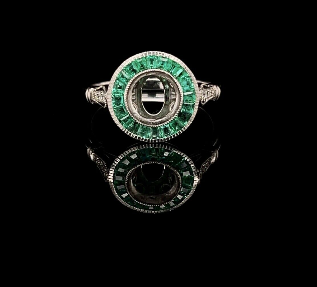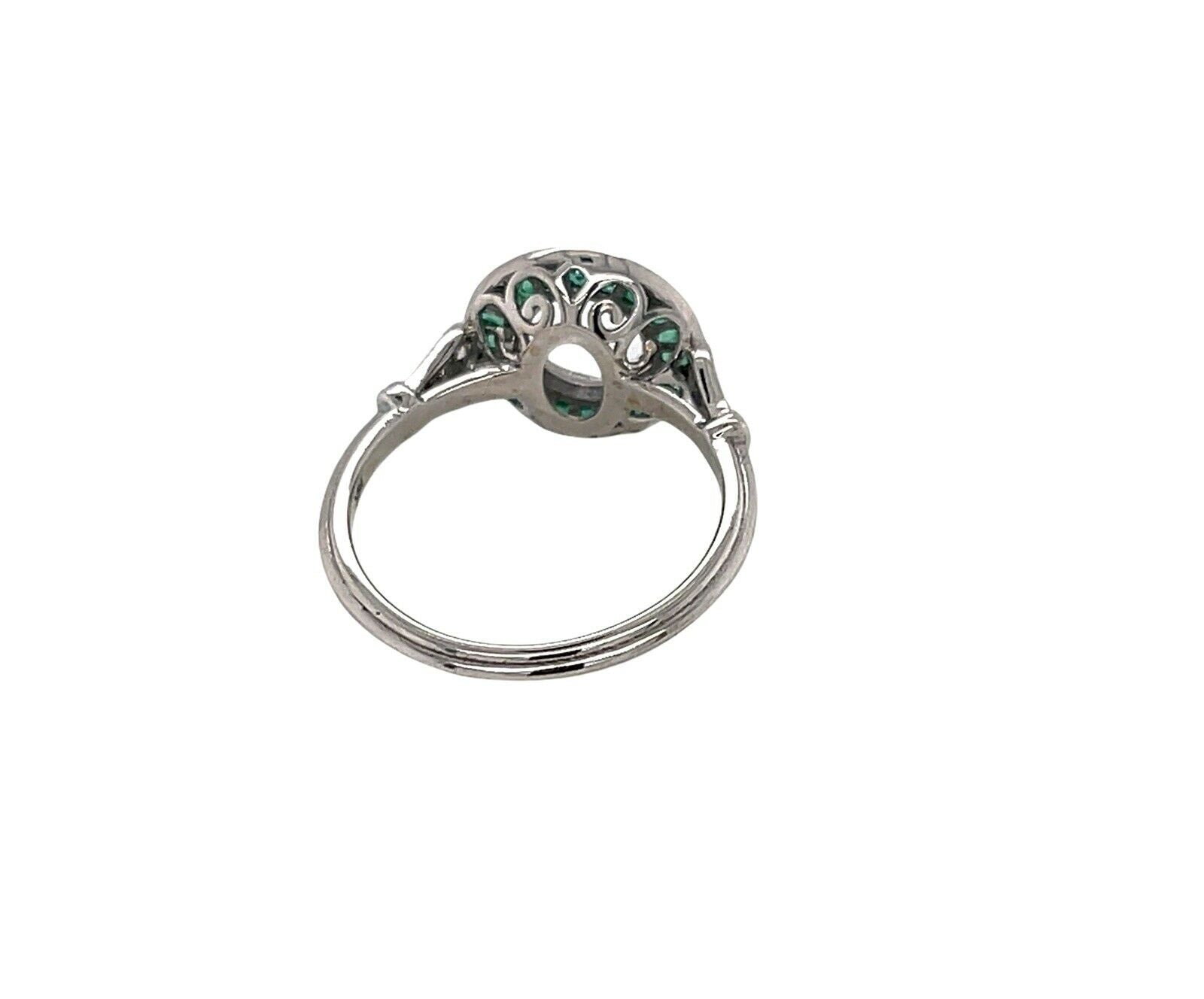 Art Deco 14K White Gold Semi Mount Ring Natural Emerald & Diamond 1 Ct Round