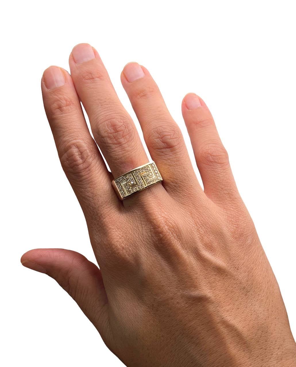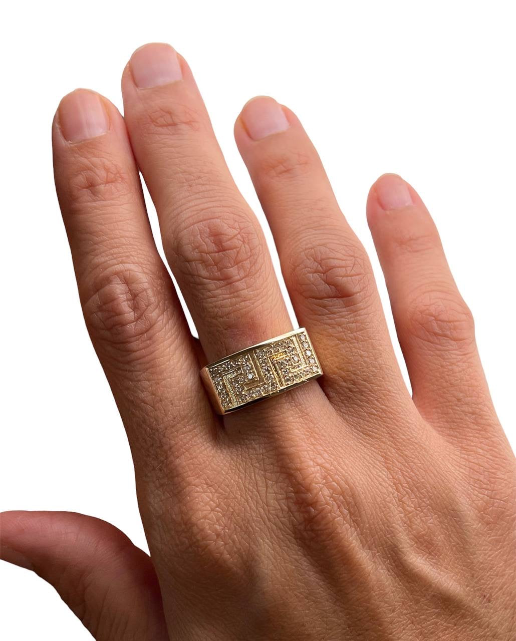 14K Solid Yellow Gold 0.52 Ct Natural Diamond Mens Greek Key Ring