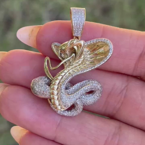 Mens 10K Solid Yellow Gold Natural Diamond Cobra Snake Charm Pendant 1.61 in