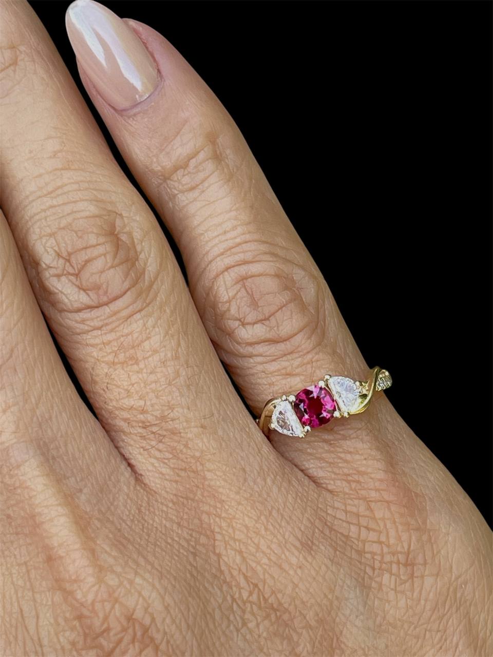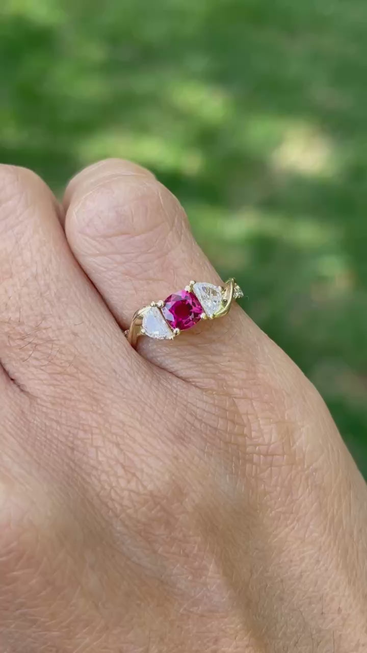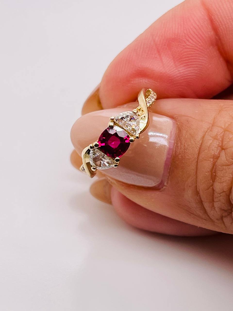 14K Solid Yellow Gold Natural Half Moon Diamond and Ruby Ring