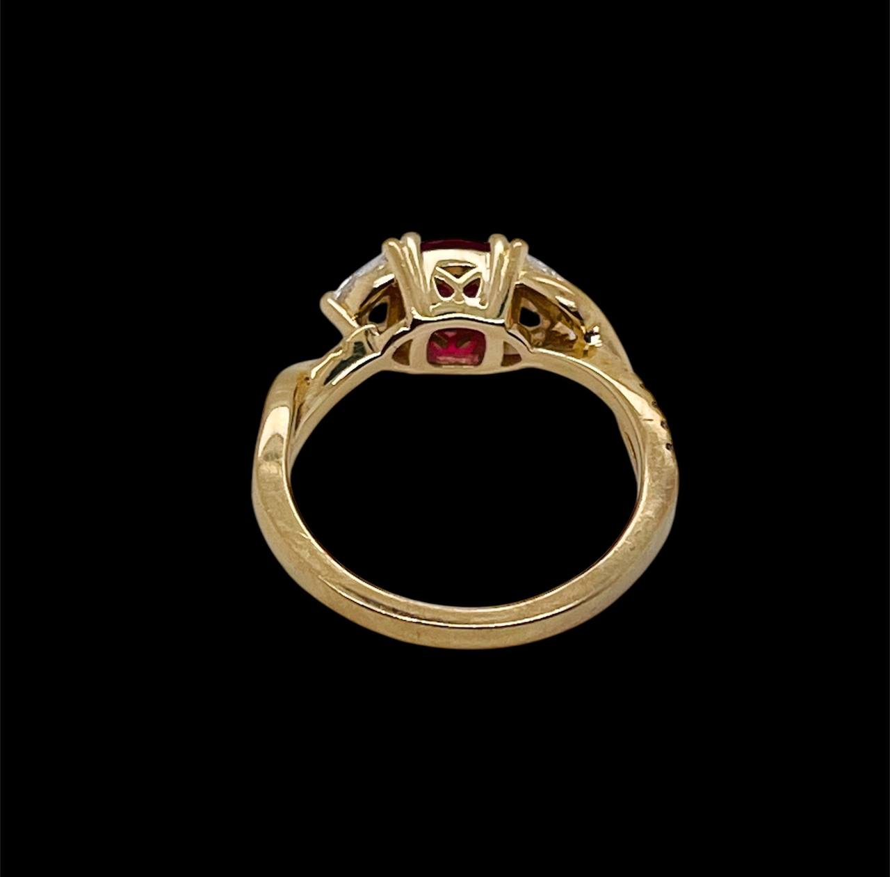 Gorgeous natural diamond and ruby 14k yellow gold ring. Weight: 2.7 grams, Size: 4.5 and sizable, Ruby weight approx: 0.60 Ct, natural, Heated, approx. 5 mm