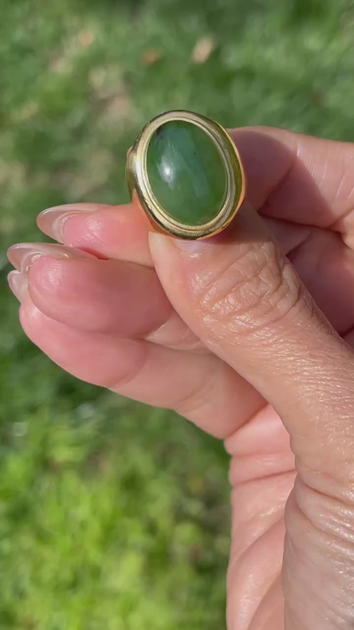 Very beautiful 18k solid yellow green jade bezel set men's pinky ring.