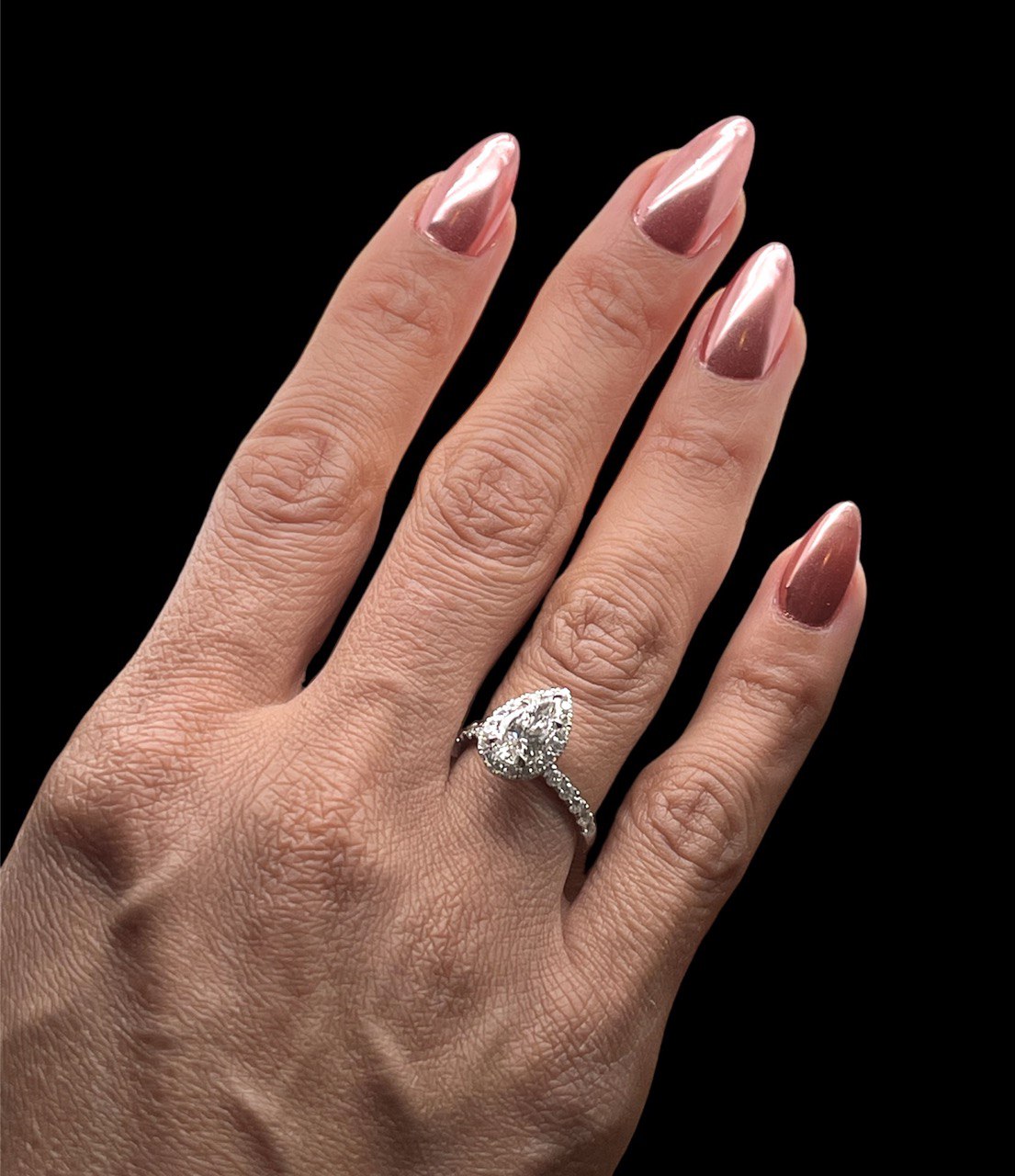 This stunning engagement ring from Amin Jewelers features a beautiful pear-shaped lab-grown diamond as the main stone with VS2 clarity and D color, surrounded by a halo of smaller diamonds. Crafted from 14k white gold, this ring is both durable and elegant, with a band width of 2.2 mm and a ring size of 6.5.