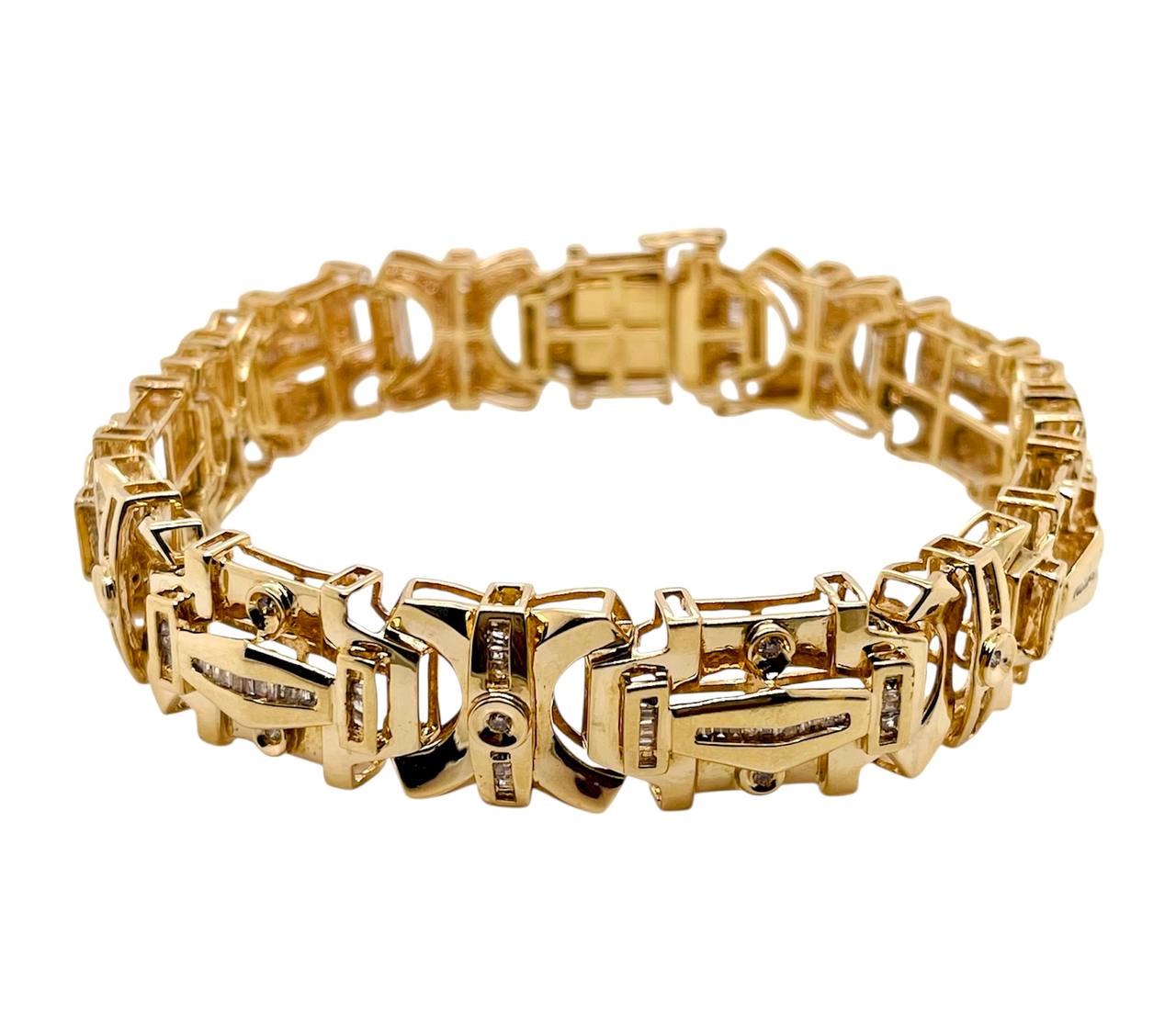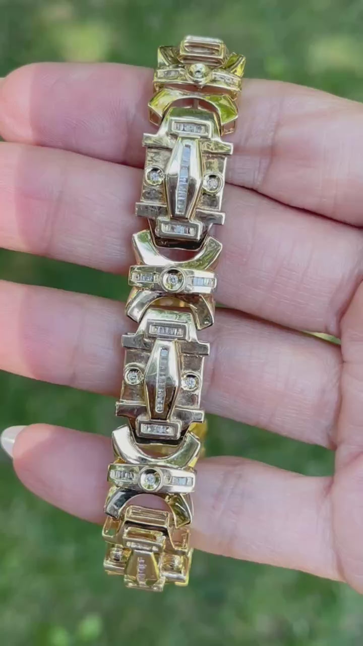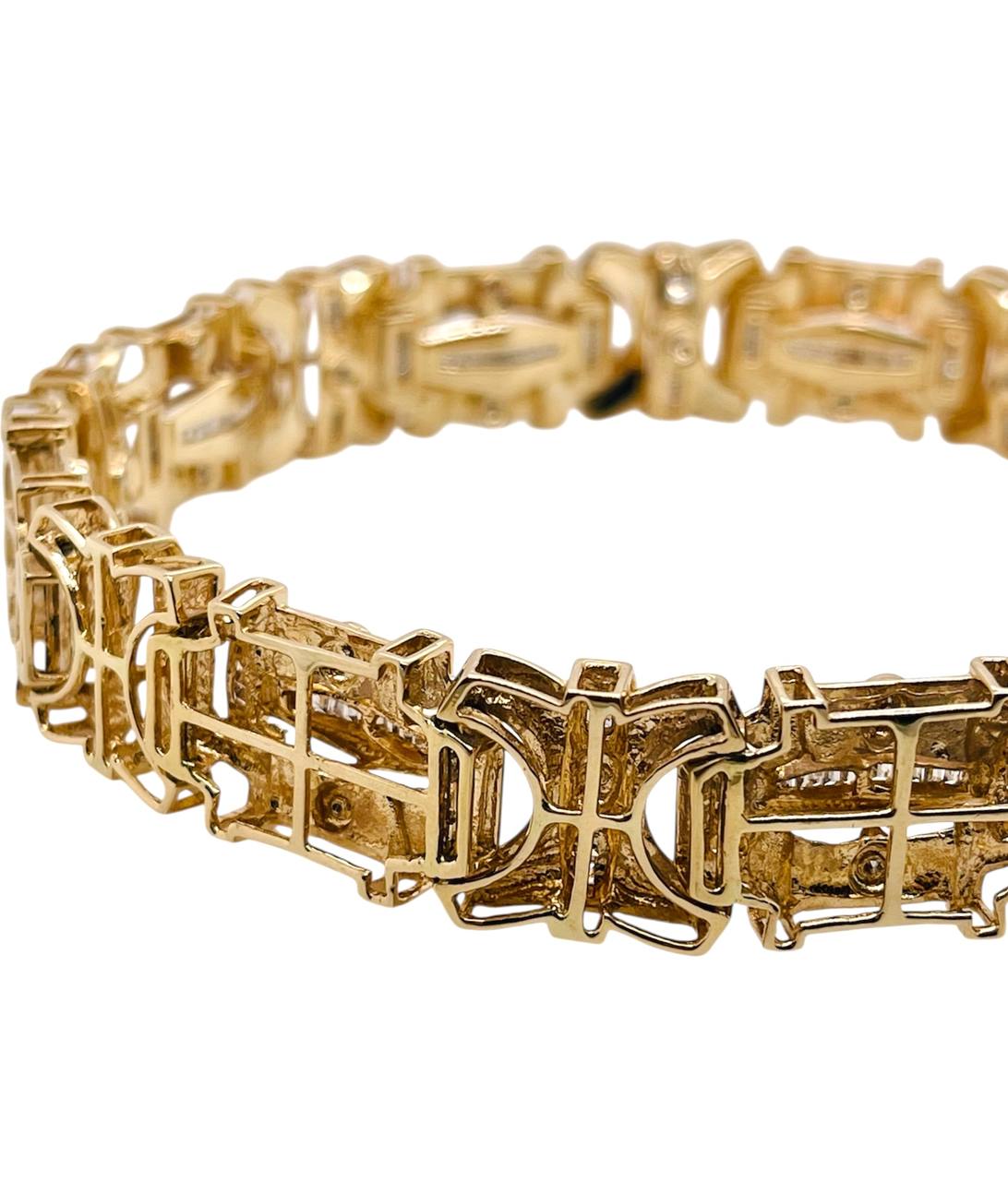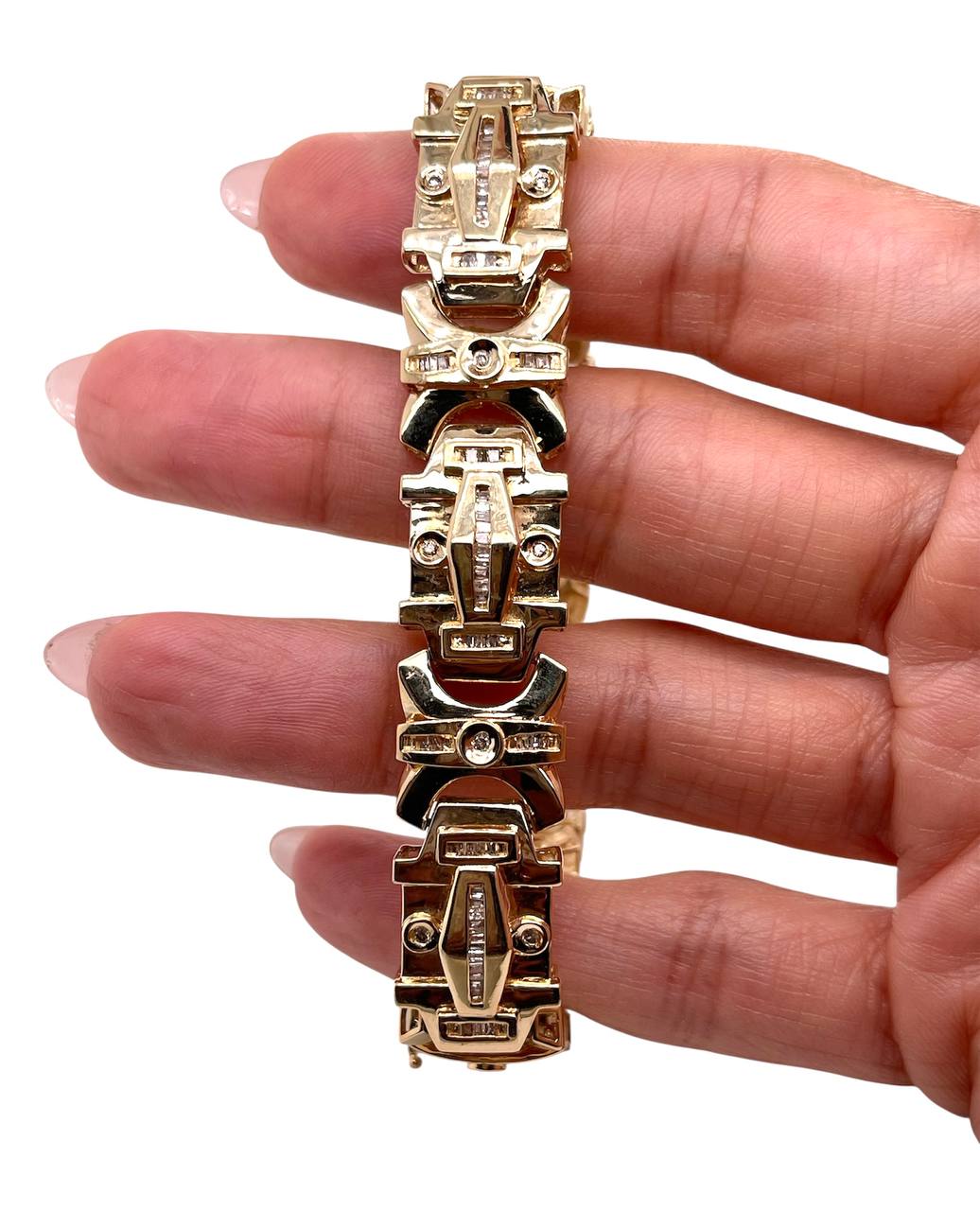 Beautiful 14k gold natural round and baguette diamond wide fancy link bracelet.