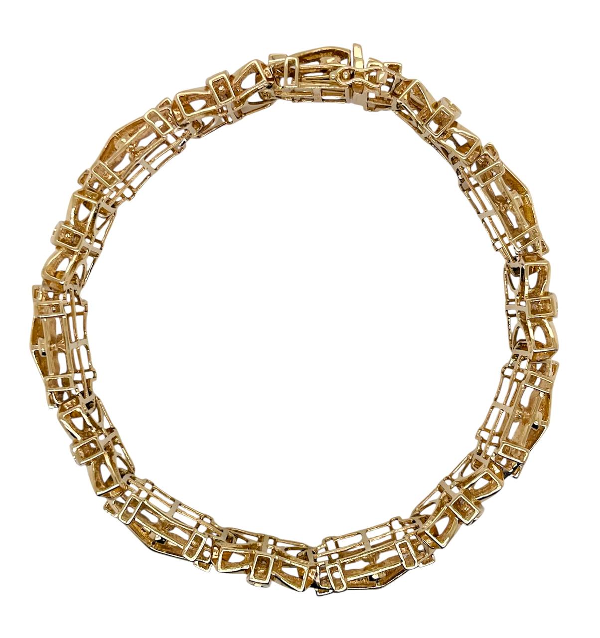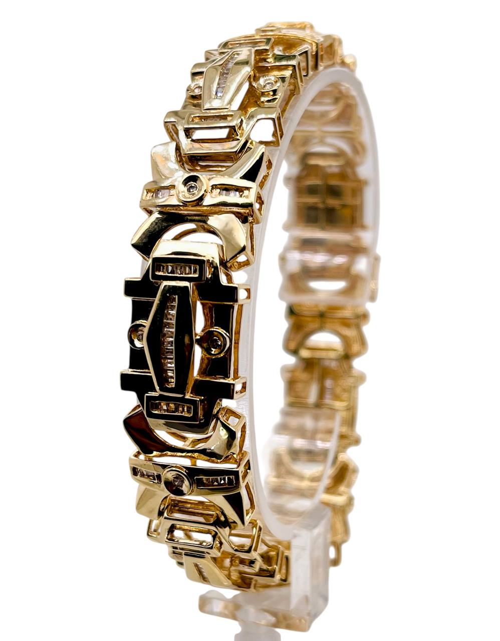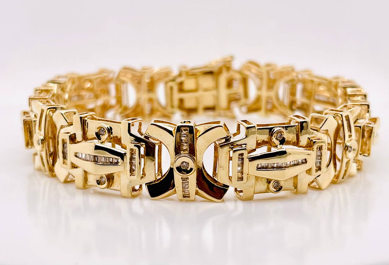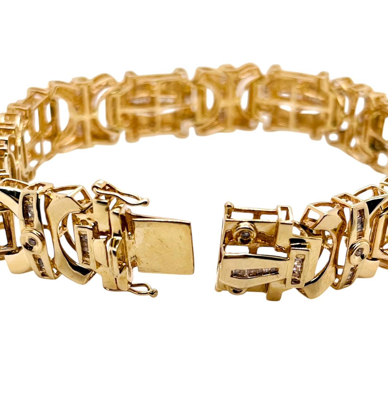 Beautiful 14k gold natural round and baguette diamond wide fancy link bracelet.
