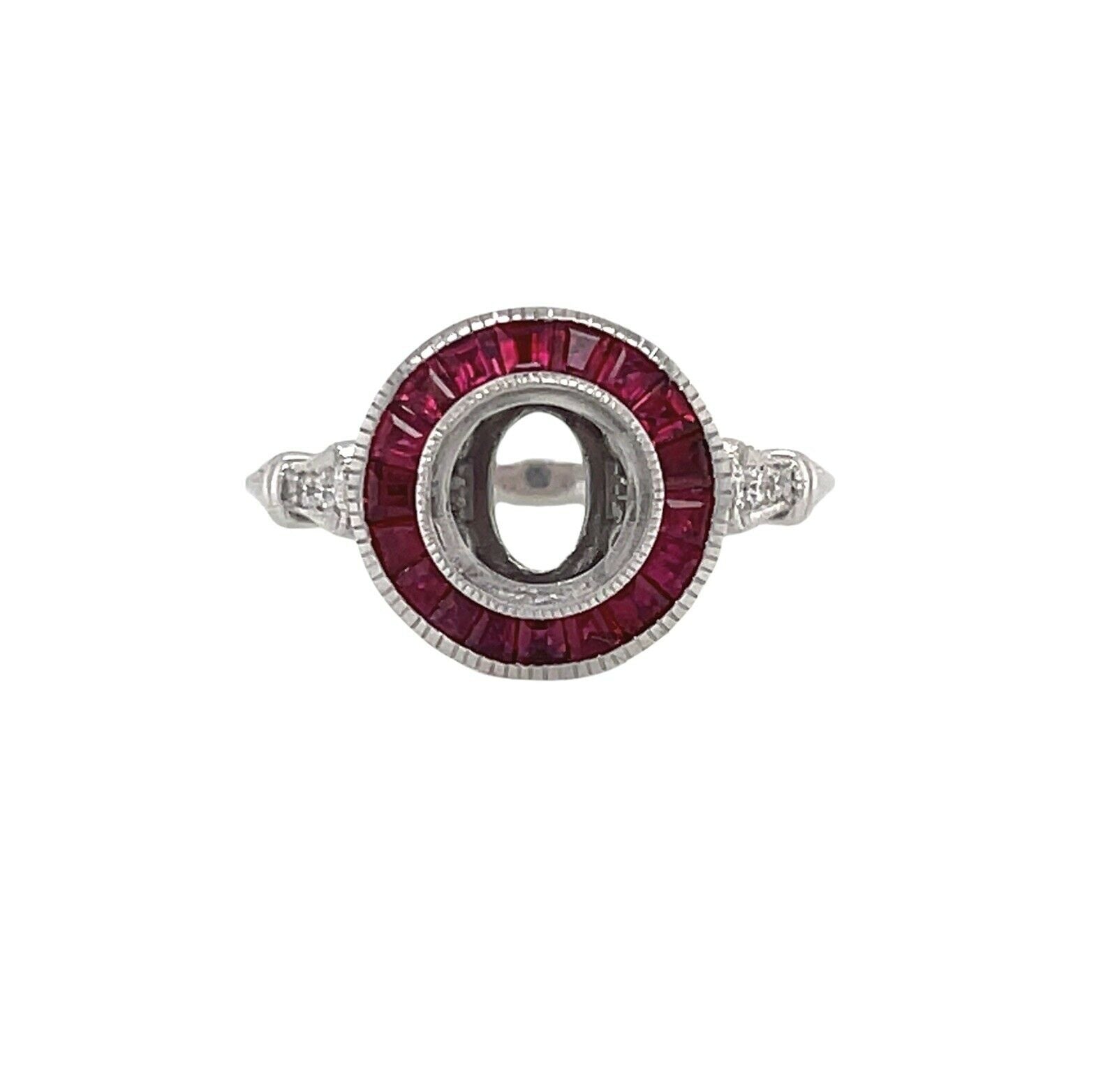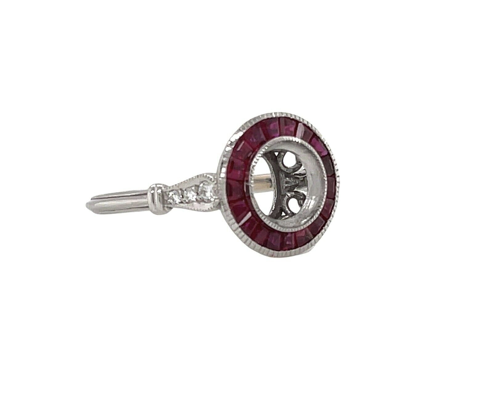 Art Deco 14K White Gold Semi Mount Ring Natural Ruby & Diamond 1 Ct Round