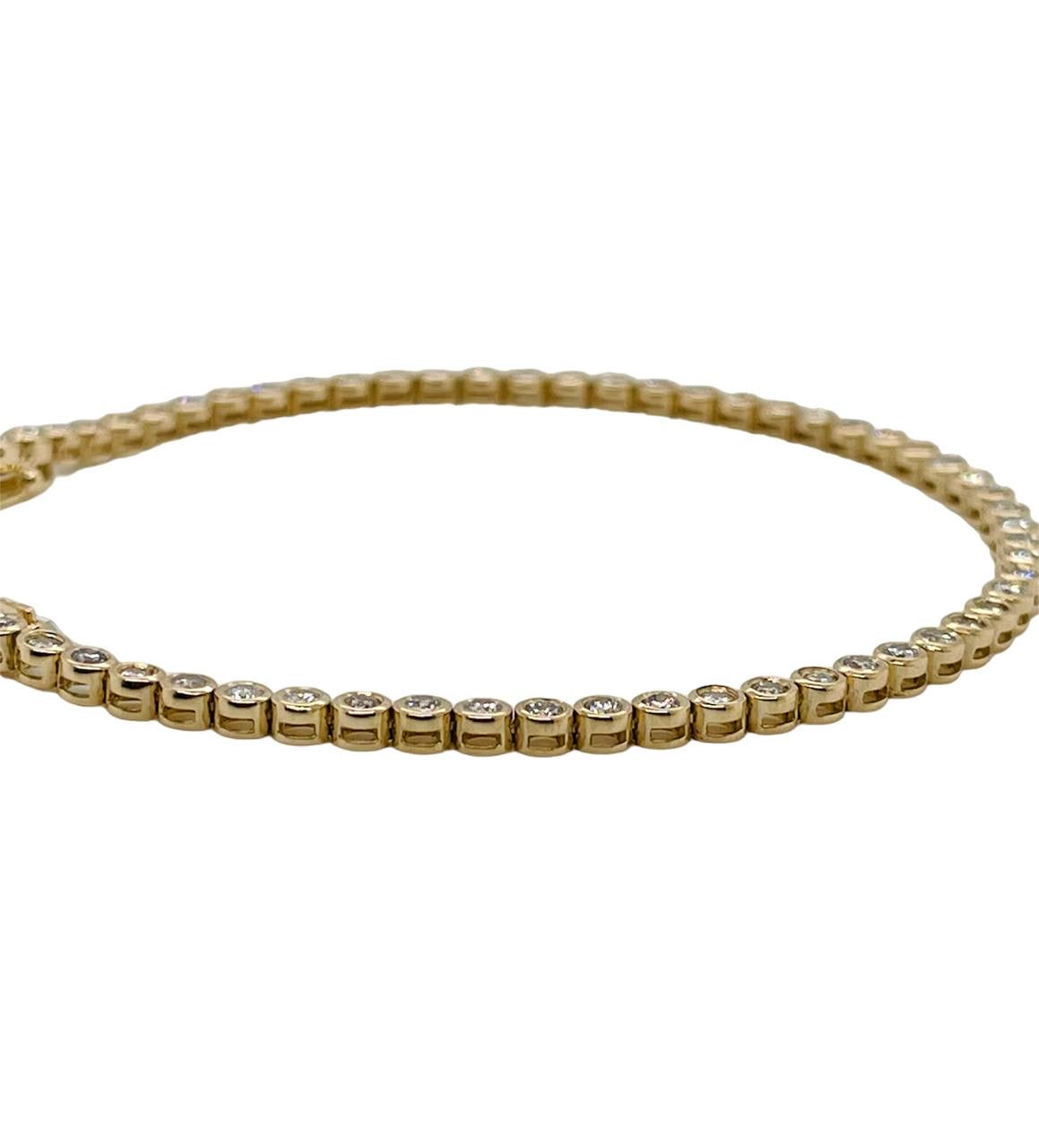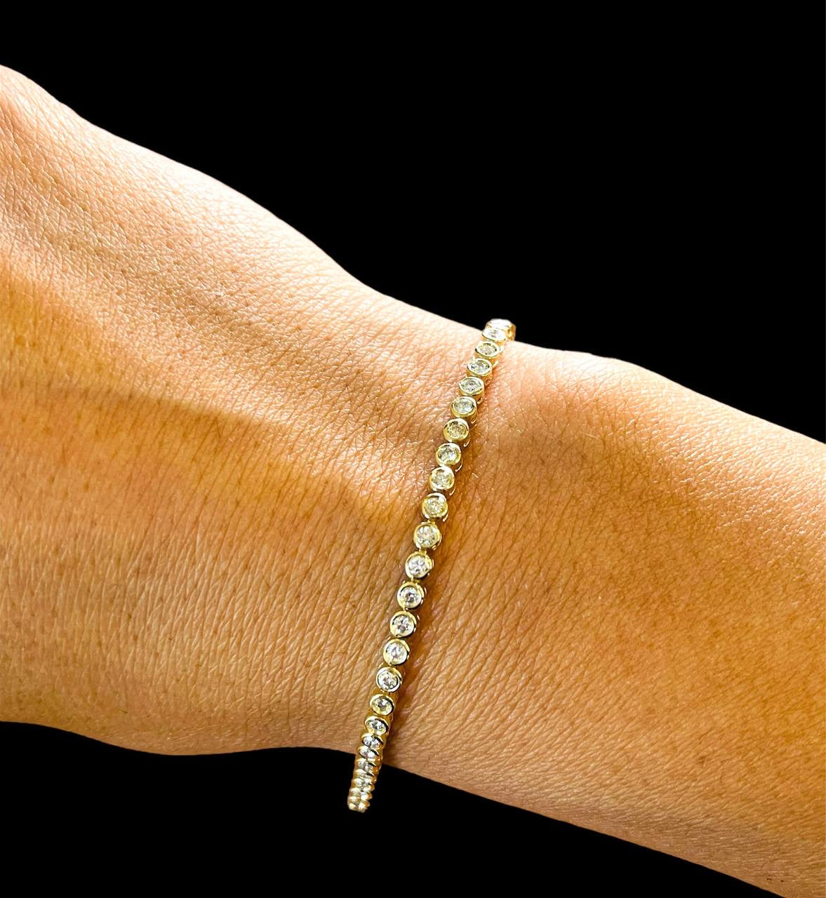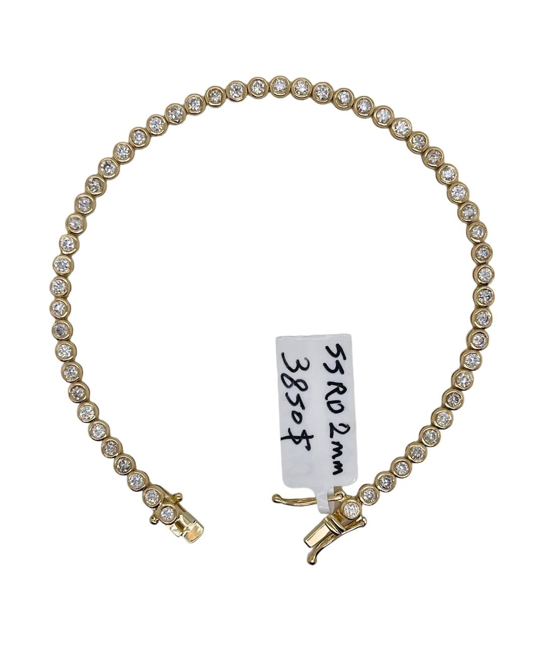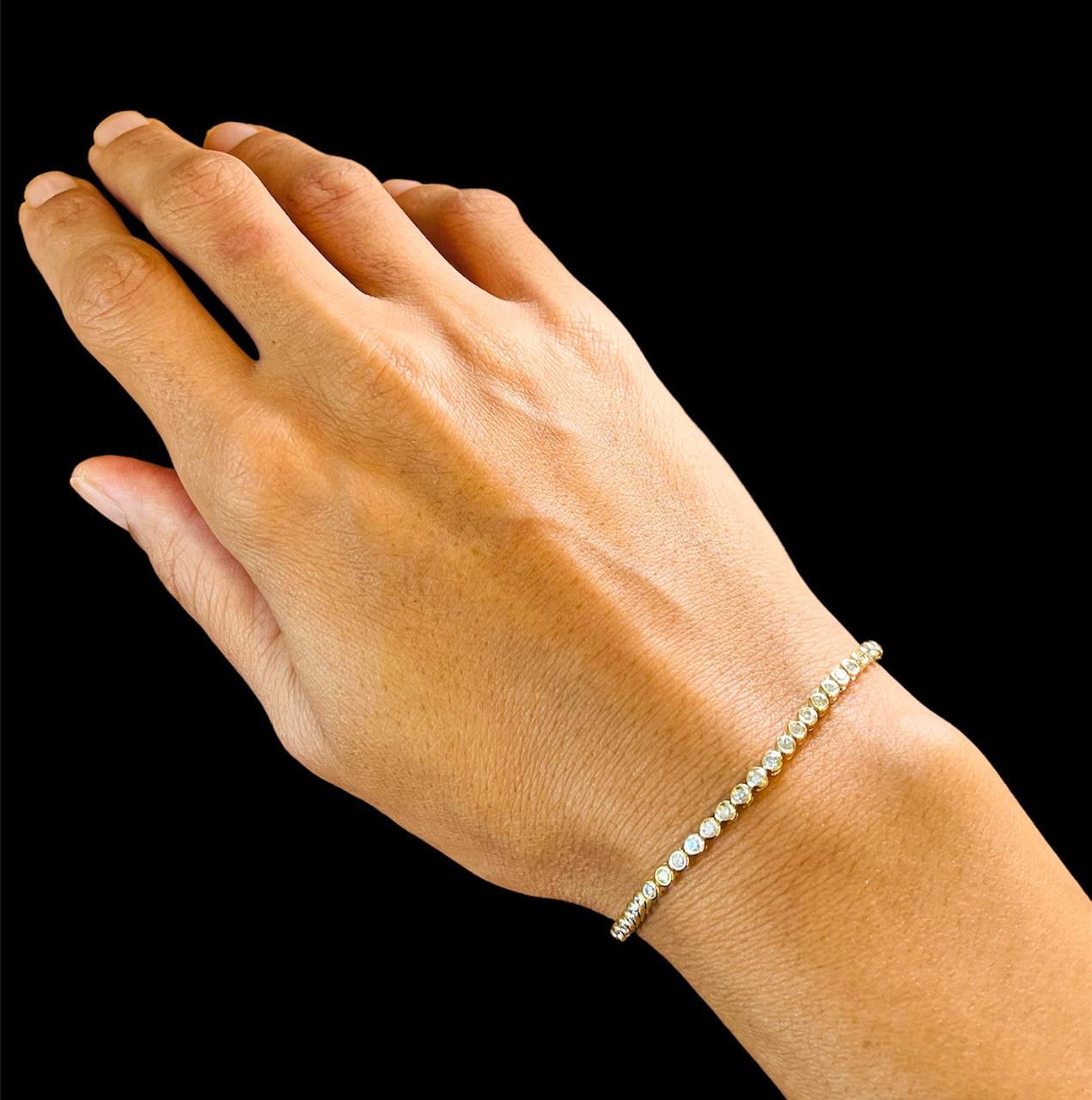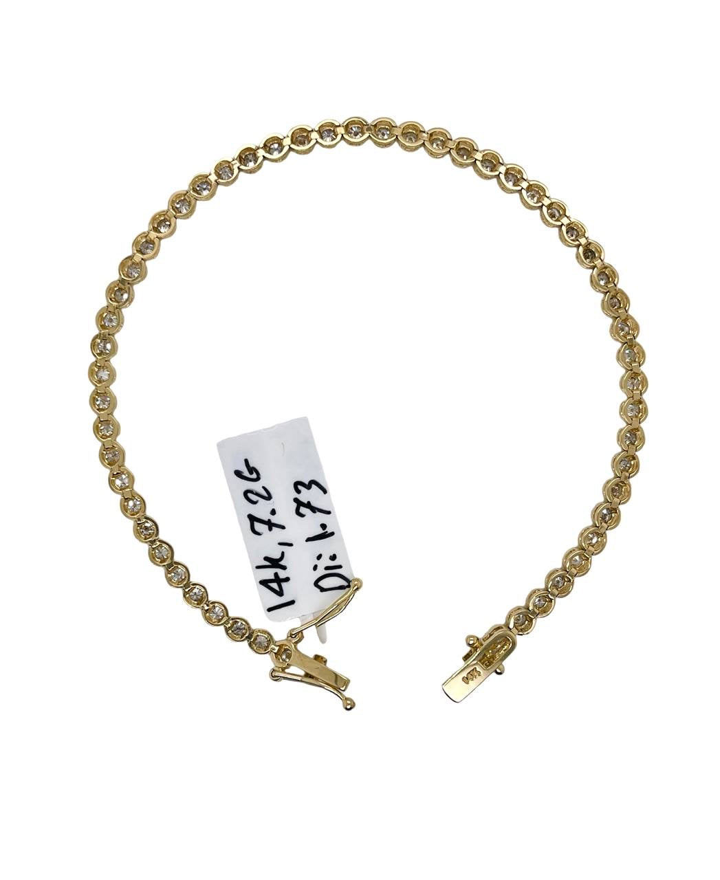 Very beautiful 14k yellow gold natural round brilliant cut diamonds dainty bezel set tennis bracelet. Weight: 7.2 grams Length: 7" Width: 3 mm Total diamond weight approx.: 1.73 Ct including 55 round diamonds each approx. 2 mm Clarity: SI2 Color: H Comes in a nice gift box! Please add me to your Favorites list