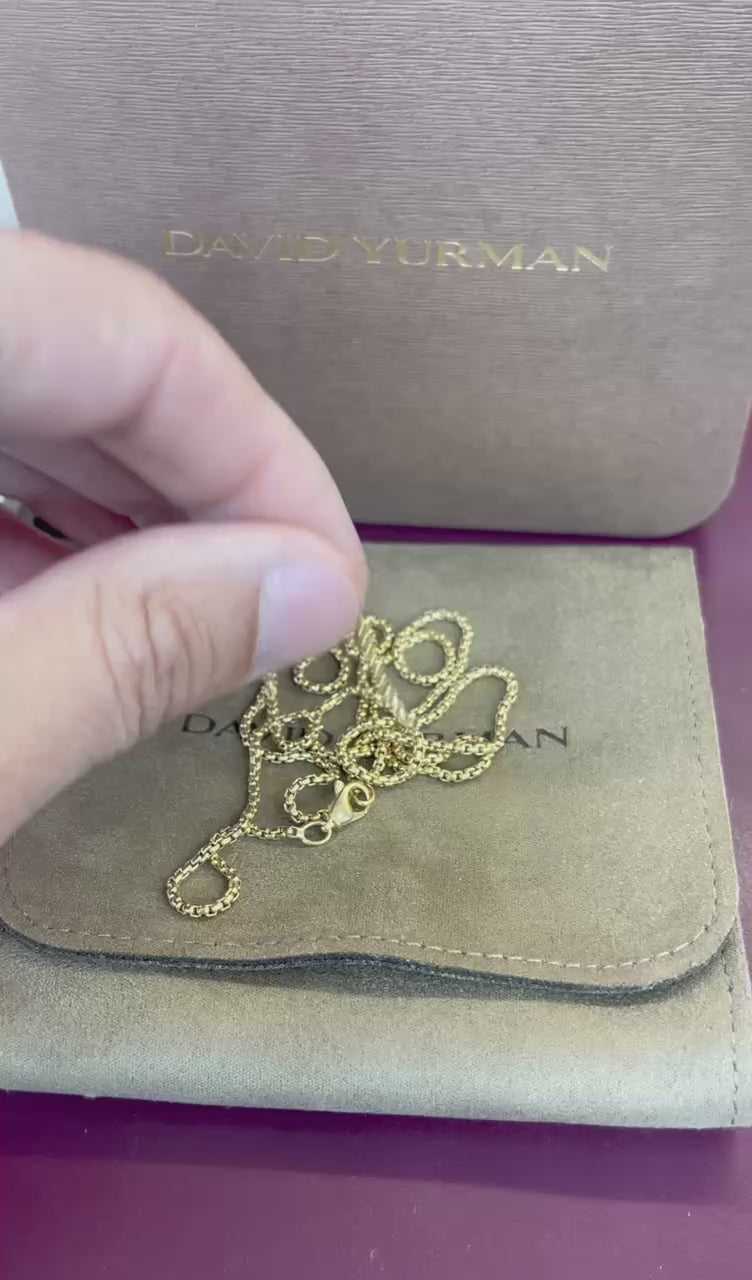 The David Yurman 18k 1.7mm Box Chain Necklace is a luxurious piece of fine jewelry crafted from real yellow gold. It features a classic chain style with a length of 26 inches and 7.5 grams weight, making it a versatile and timeless accessory. This necklace is perfect for adding a touch of elegance to any outfit, and its sturdy construction and high-quality craftsmanship make it a stylish and reliable piece of jewelry for years to come. Comes in an after market David Yurman box and gift bag!