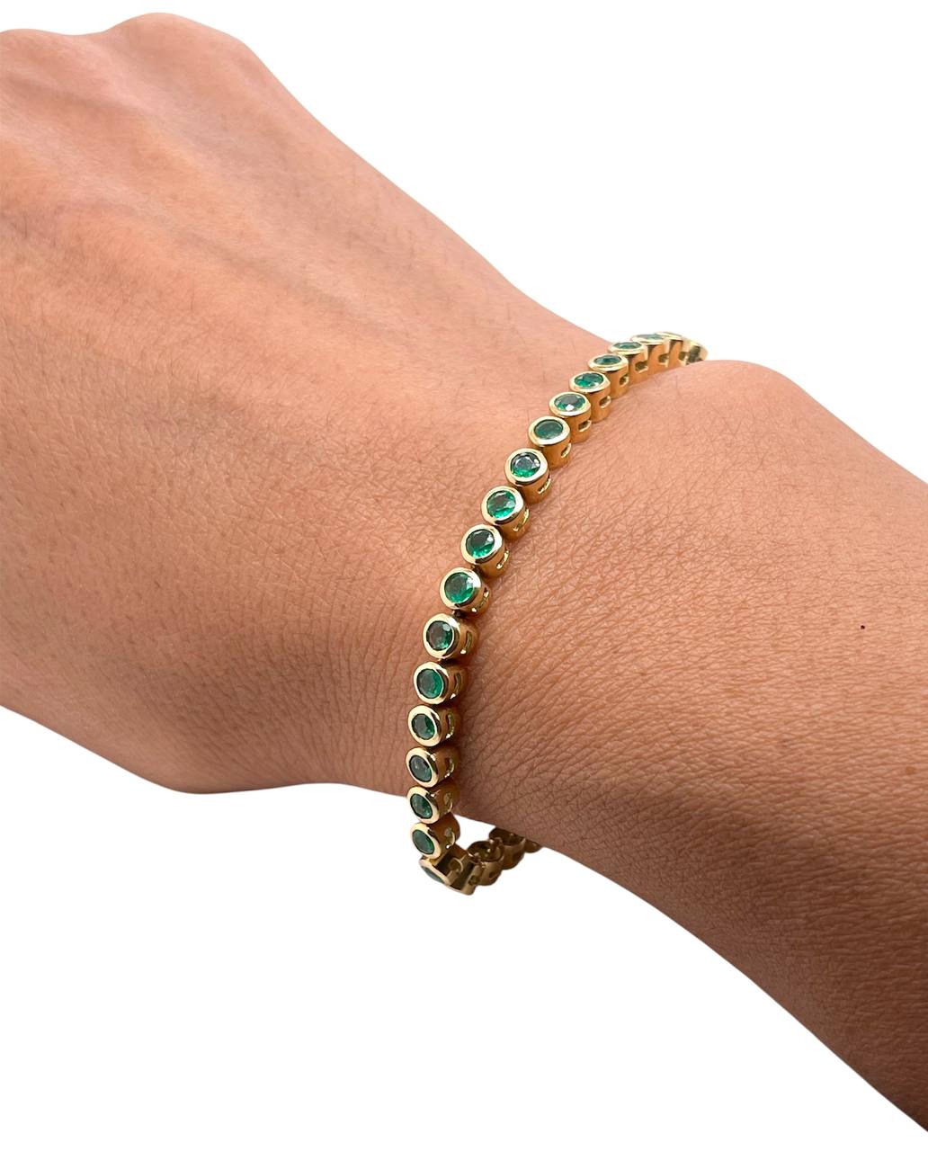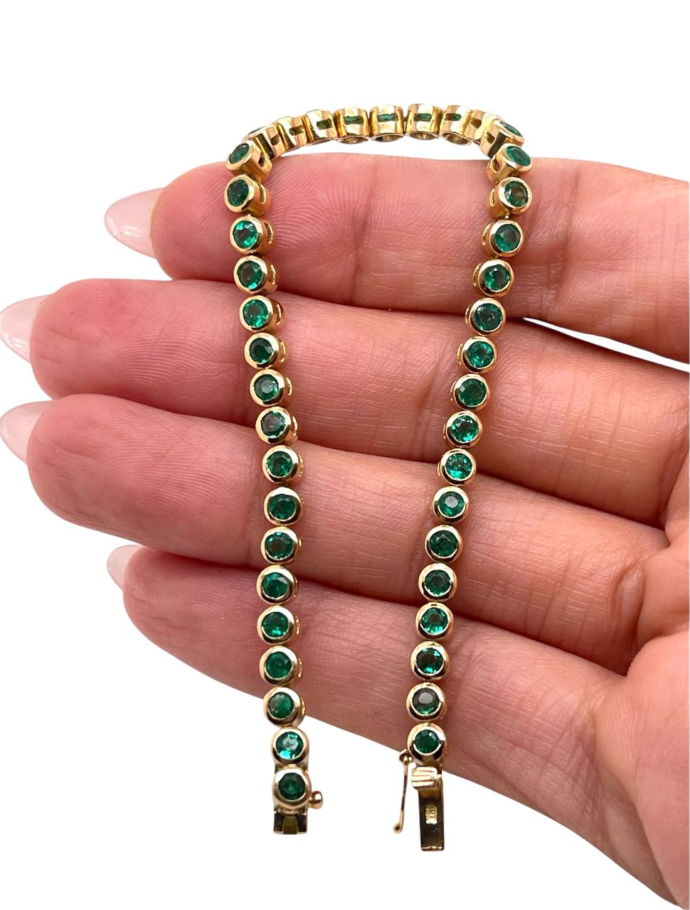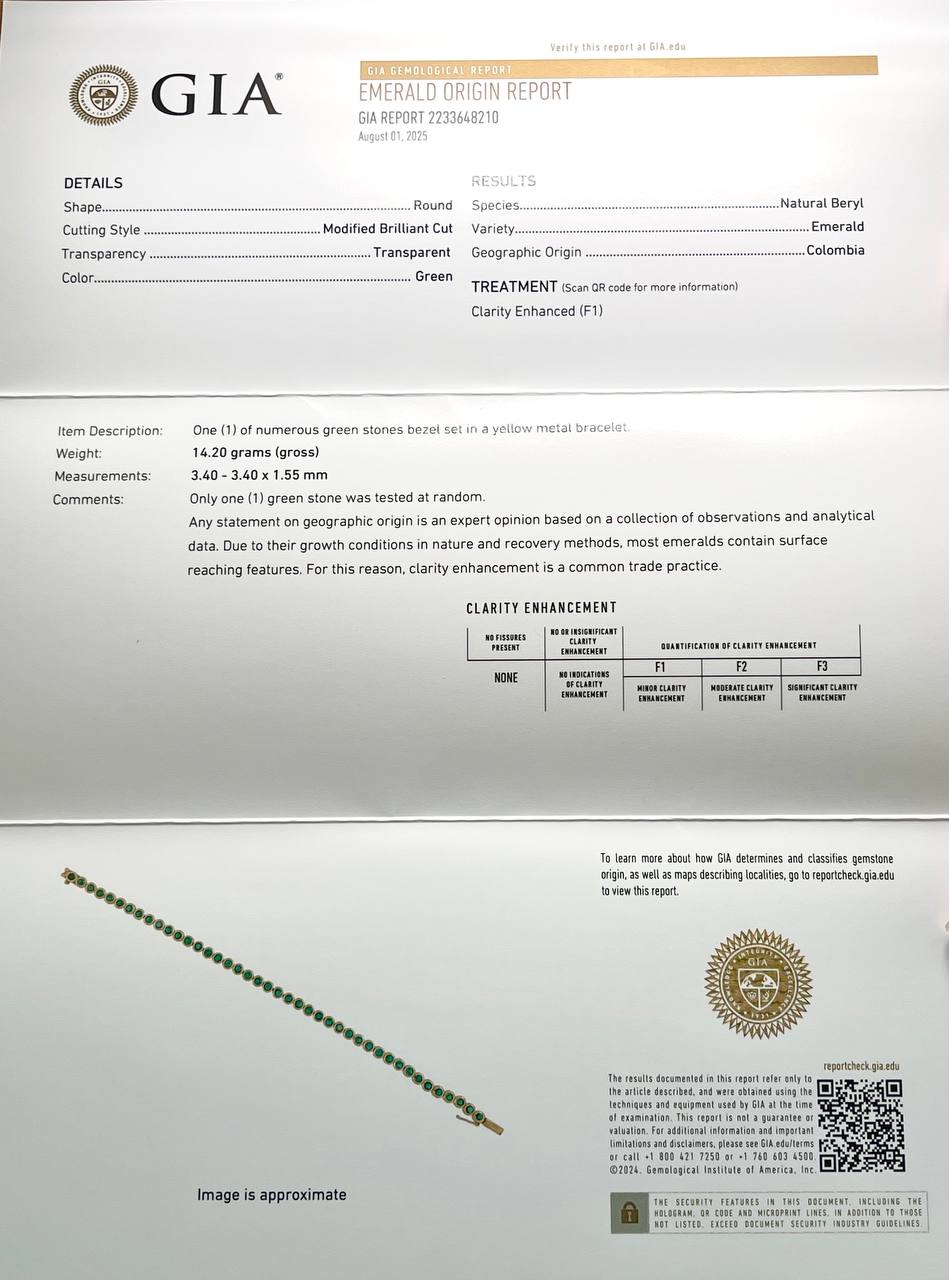 This GIA Certified Natural Colombian Emerald 18k Gold Bezel Set Tennis Bracelet is a stunning piece of fine jewelry perfect to be added to your collection. The bracelet features 42 beautiful matching colors round green emeralds, The tennis style design is set in 18k solid yellow gold, with a bezel setting for a secure fit. With a total carat weight of 3.5-4 tcw, one stone has been randomly graded by GIA with a minimal treatment of F1 measuring approx. 3.4-3.4x1.55 mm with GIA report number 2233648210, this bracelet exudes beauty and elegance, making it a perfect gift for your beloved. Bracelet weight is 14.2 grams, length approx. 7.25 inches and width 4.1 mm.