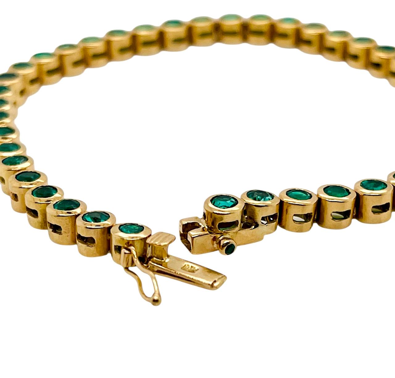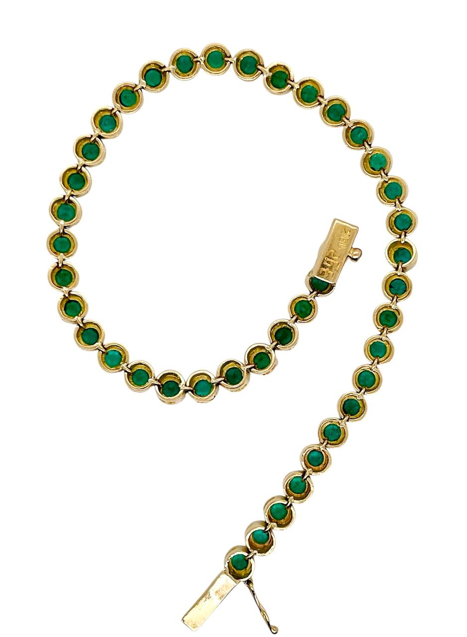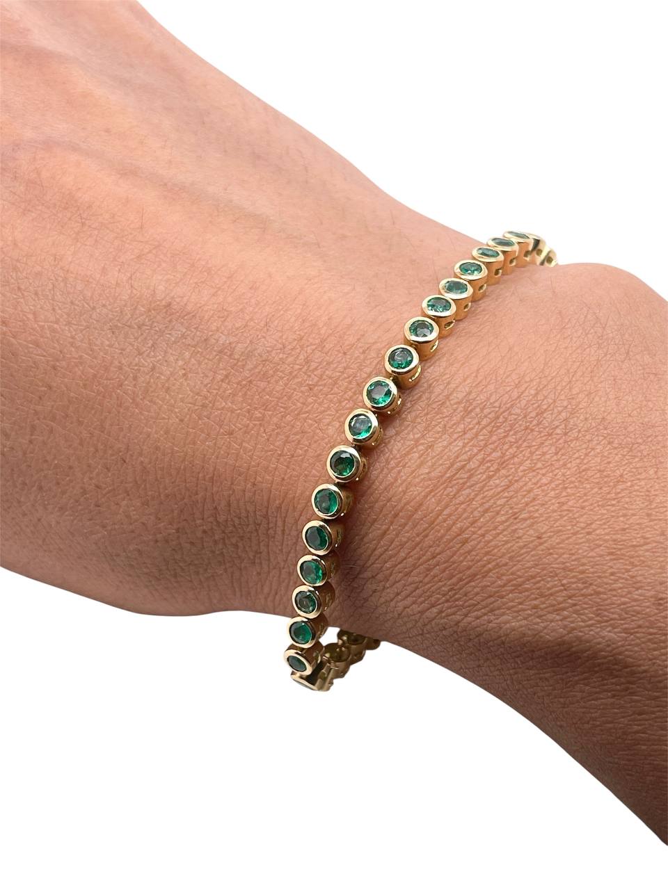 This GIA Certified Natural Colombian Emerald 18k Gold Bezel Set Tennis Bracelet is a stunning piece of fine jewelry perfect to be added to your collection. The bracelet features 42 beautiful matching colors round green emeralds, The tennis style design is set in 18k solid yellow gold, with a bezel setting for a secure fit. With a total carat weight of 3.5-4 tcw, one stone has been randomly graded by GIA with a minimal treatment of F1 measuring approx. 3.4-3.4x1.55 mm with GIA report number 2233648210, this bracelet exudes beauty and elegance, making it a perfect gift for your beloved. Bracelet weight is 14.2 grams, length approx. 7.25 inches and width 4.1 mm.