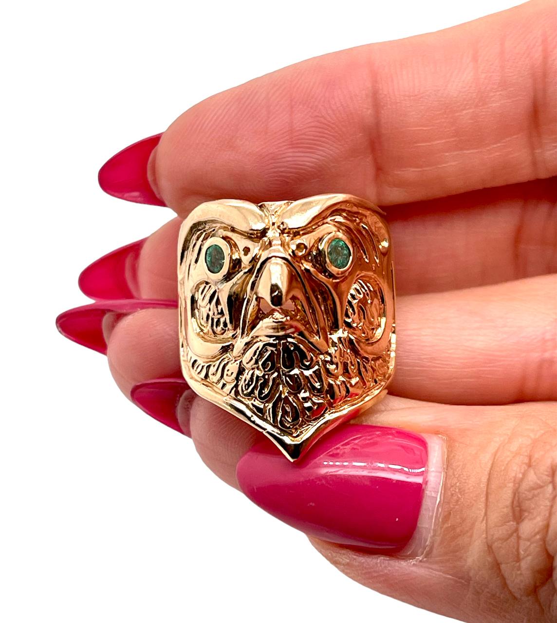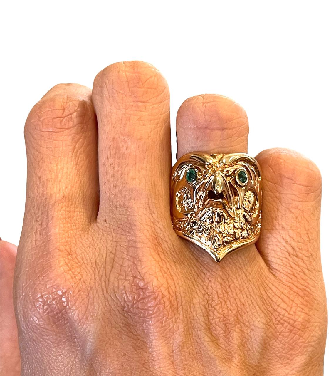 Vintage 14K Solid Yellow Gold Mens Falcon Eagle Emerald Eyes Ankh Ring 19 Grams