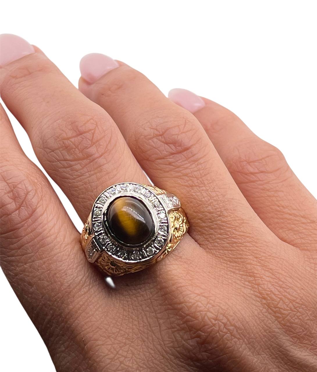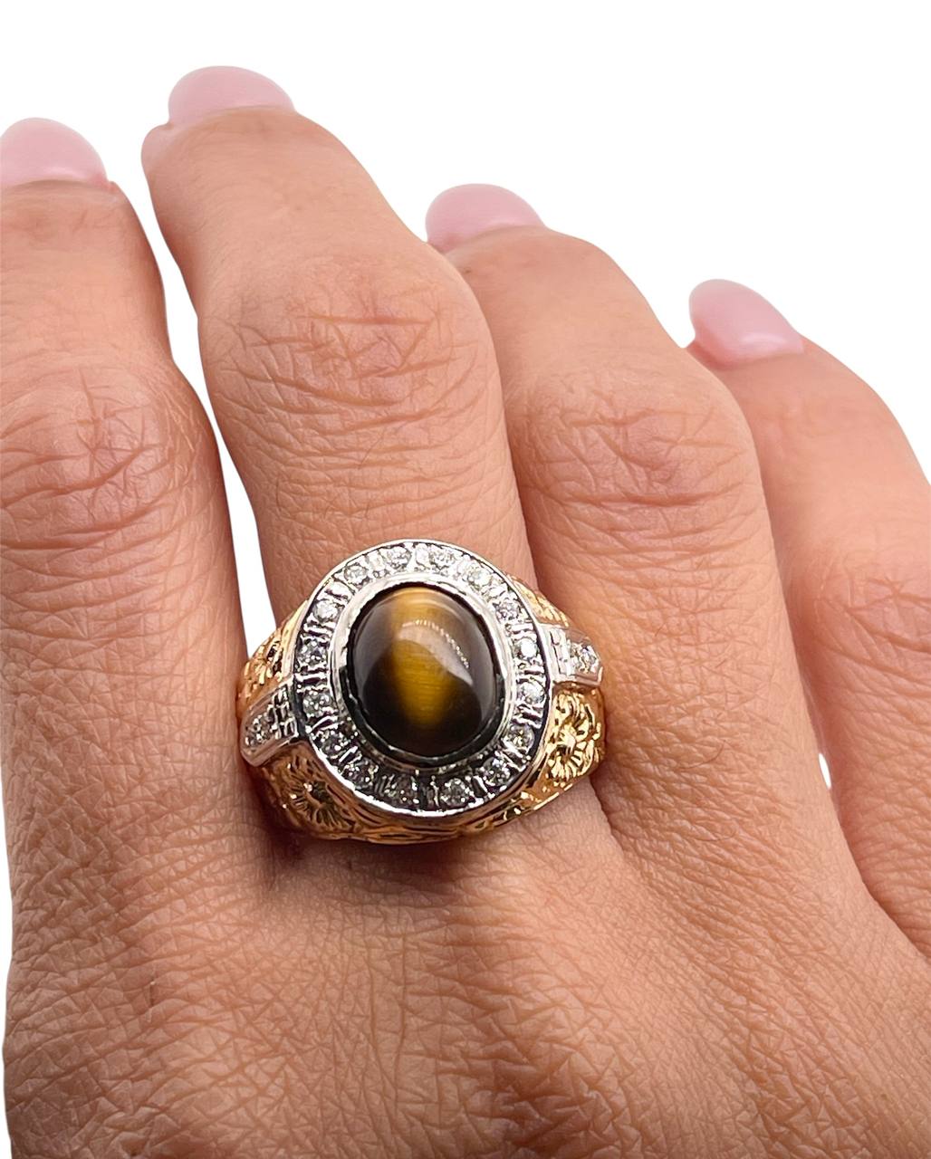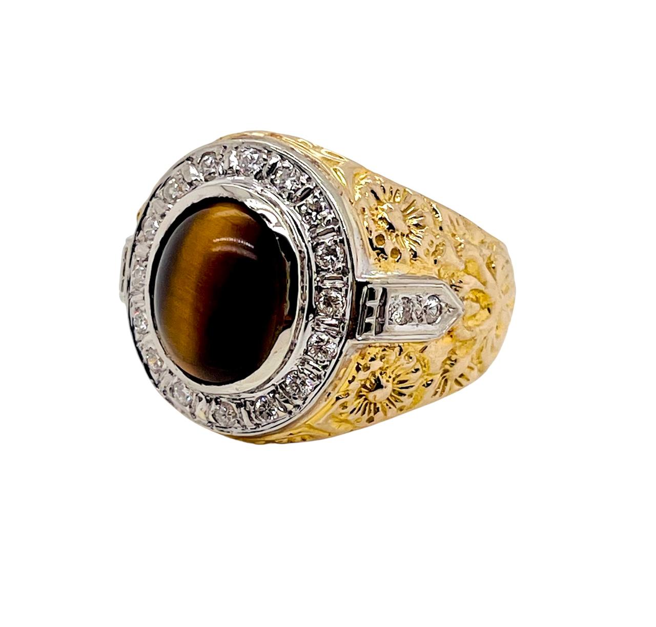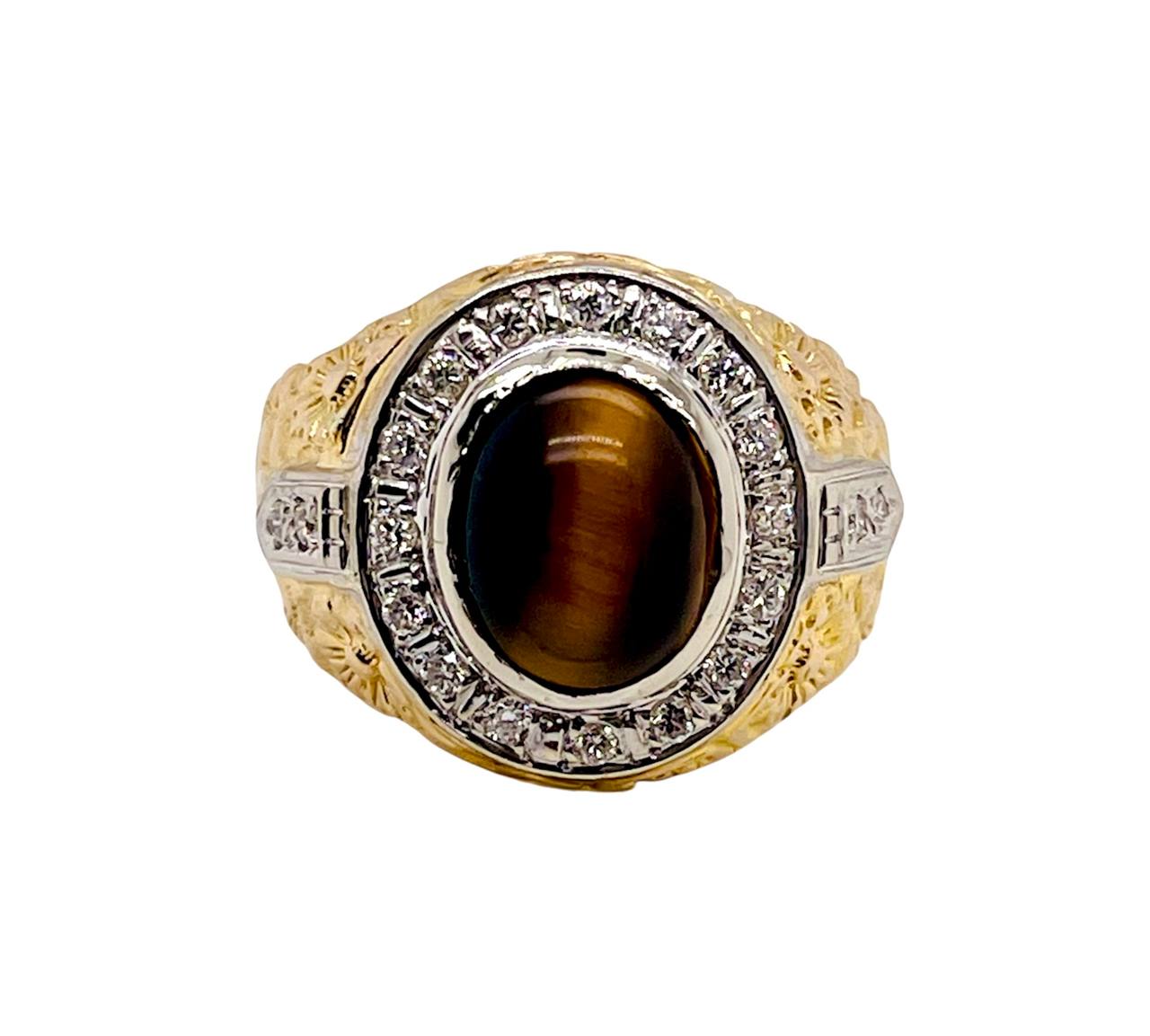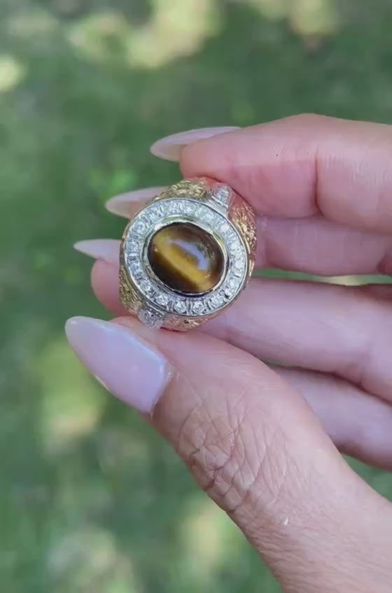 Vintage 14K Solid Yellow Gold Natural Diamond Tiger's Eye Mens Ring 16.3 Grams Size 10