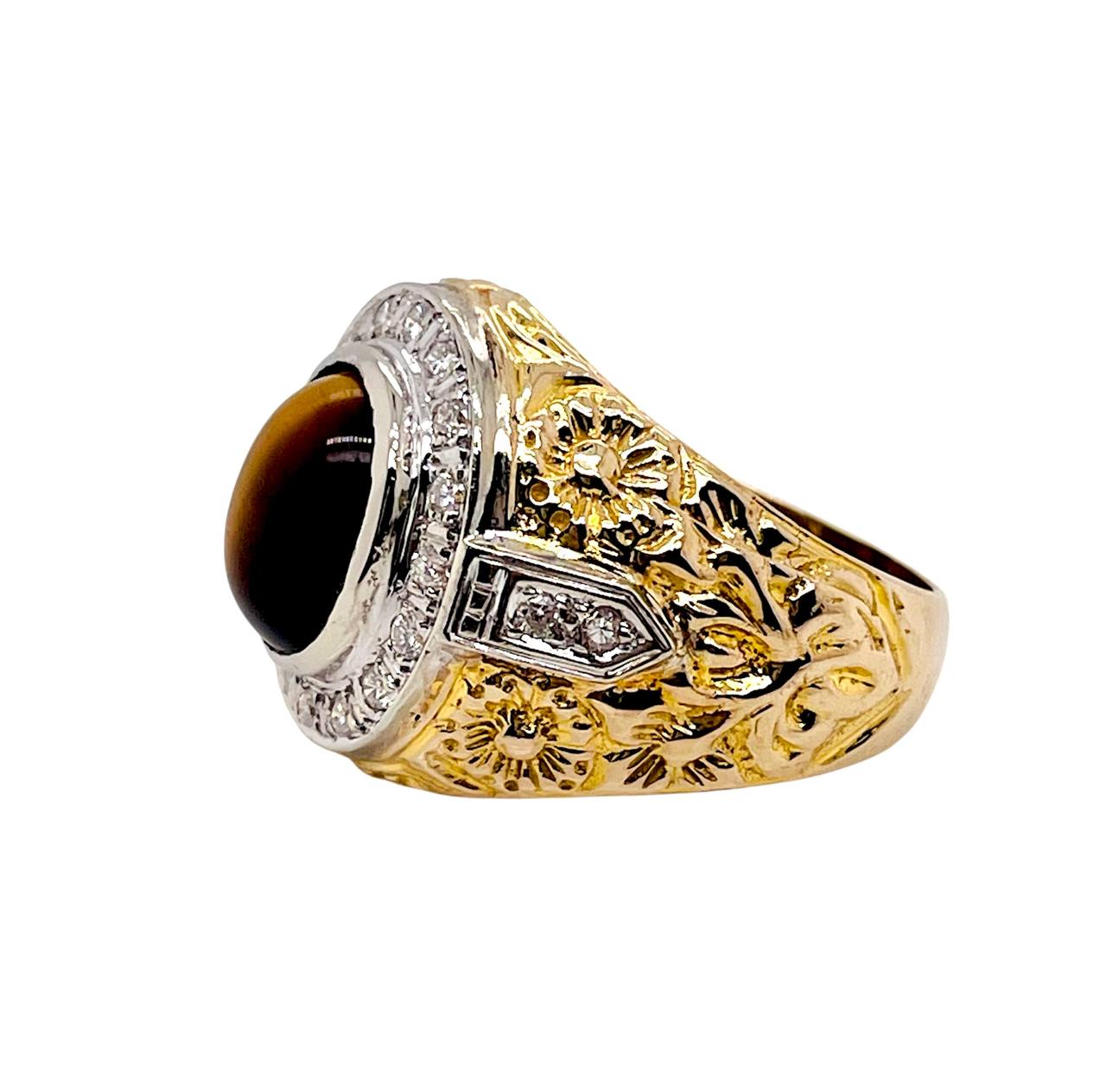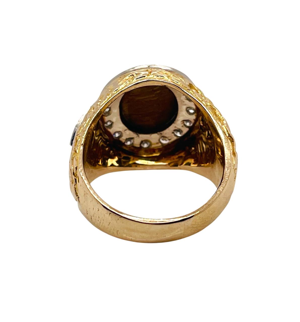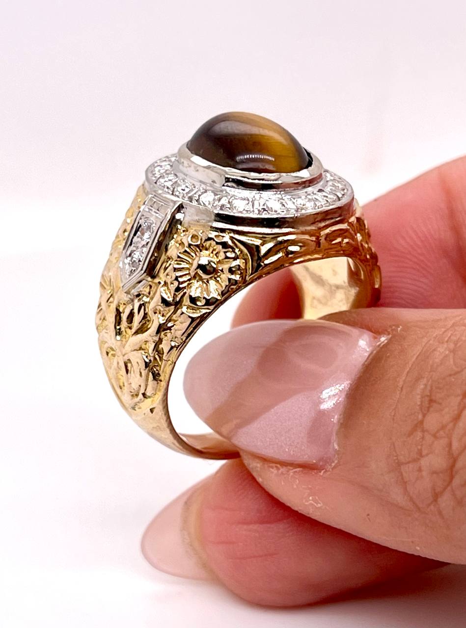 Very beautiful vintage 14k solid yellow gold diamond and tiger's eye bezel set men's ring.